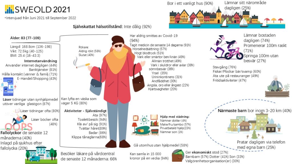 Under 2022 avslutades den sjätte omgången av SWEOLD, där 1 599 personer bosatta i Sverige intervjuades om sina levnadsvillkor, såsom hälsa, vård och omsorgsbehov, familjeförhållanden och vardagliga aktiviteter.